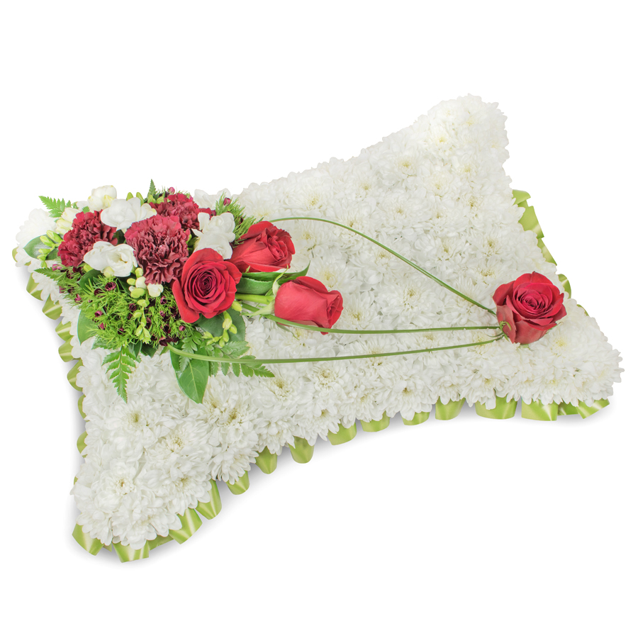Convey your sympathy with our graceful floral arrangement, featuring white chrysanthemums, red roses, white freesias, and dark red carnations. Enhanced with dianthus and bear grass, this bouquet embodies both beauty and heartfelt emotion.